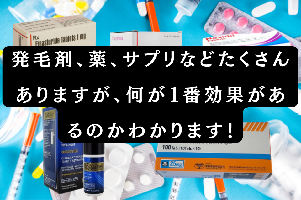 国内外の育毛・発毛剤、育毛サプリメント、育毛サロン施術、漢方薬、フィナステリド、デュタステリド、ミノキシジル溶液、ミノキシジルタブレット、スピロノラクトン、AGA治療、などなど